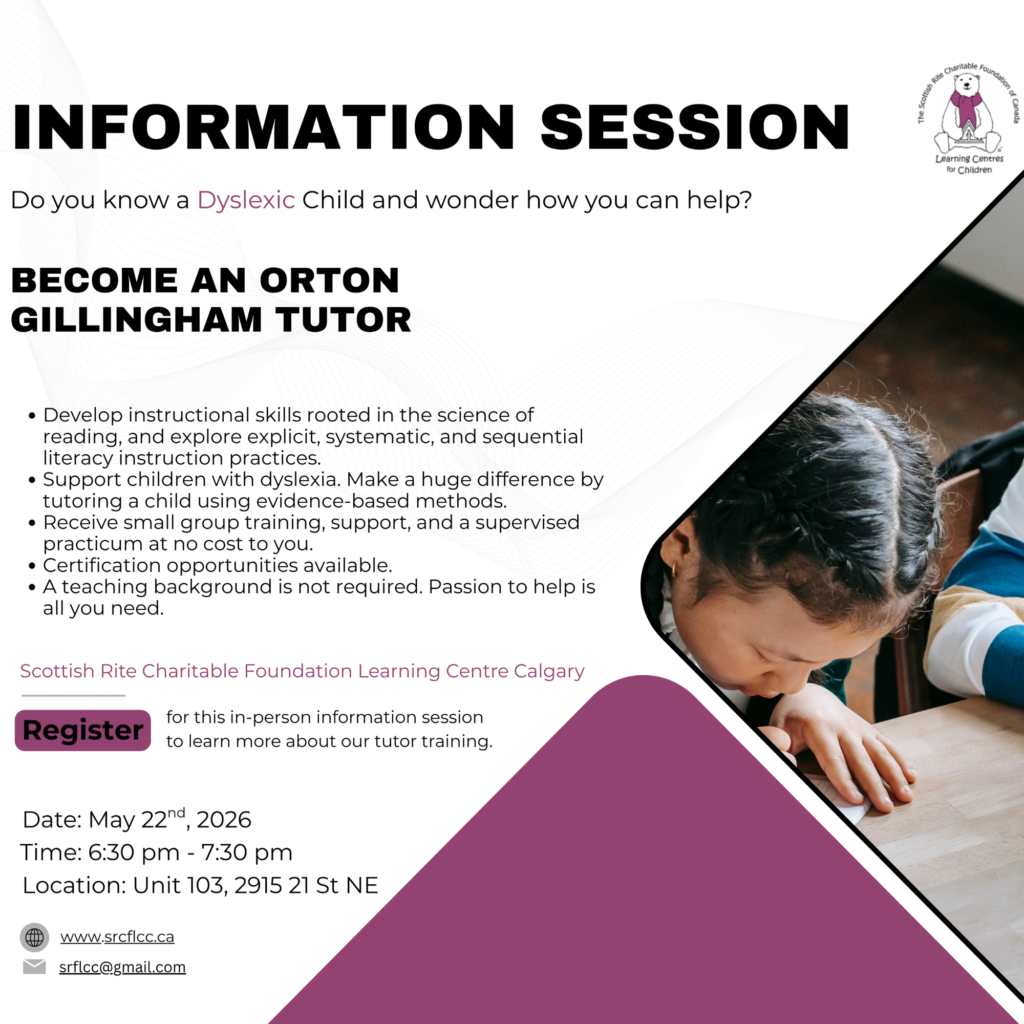 The Scottish Rite Charitable Foundation Learning Centre for Calgary offers, one-on-one tutoring to children who struggle with reading at no cost to the family.